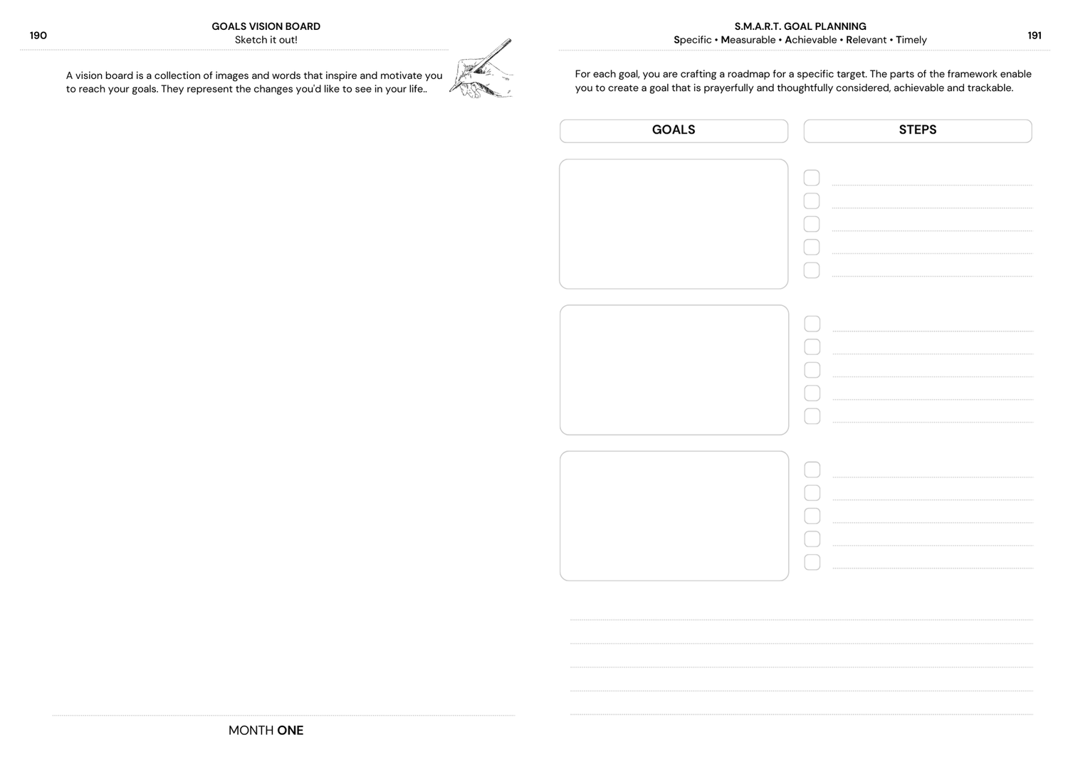 - The left is a Vision Board to sketch images or words to inspire you to reach your goals.
