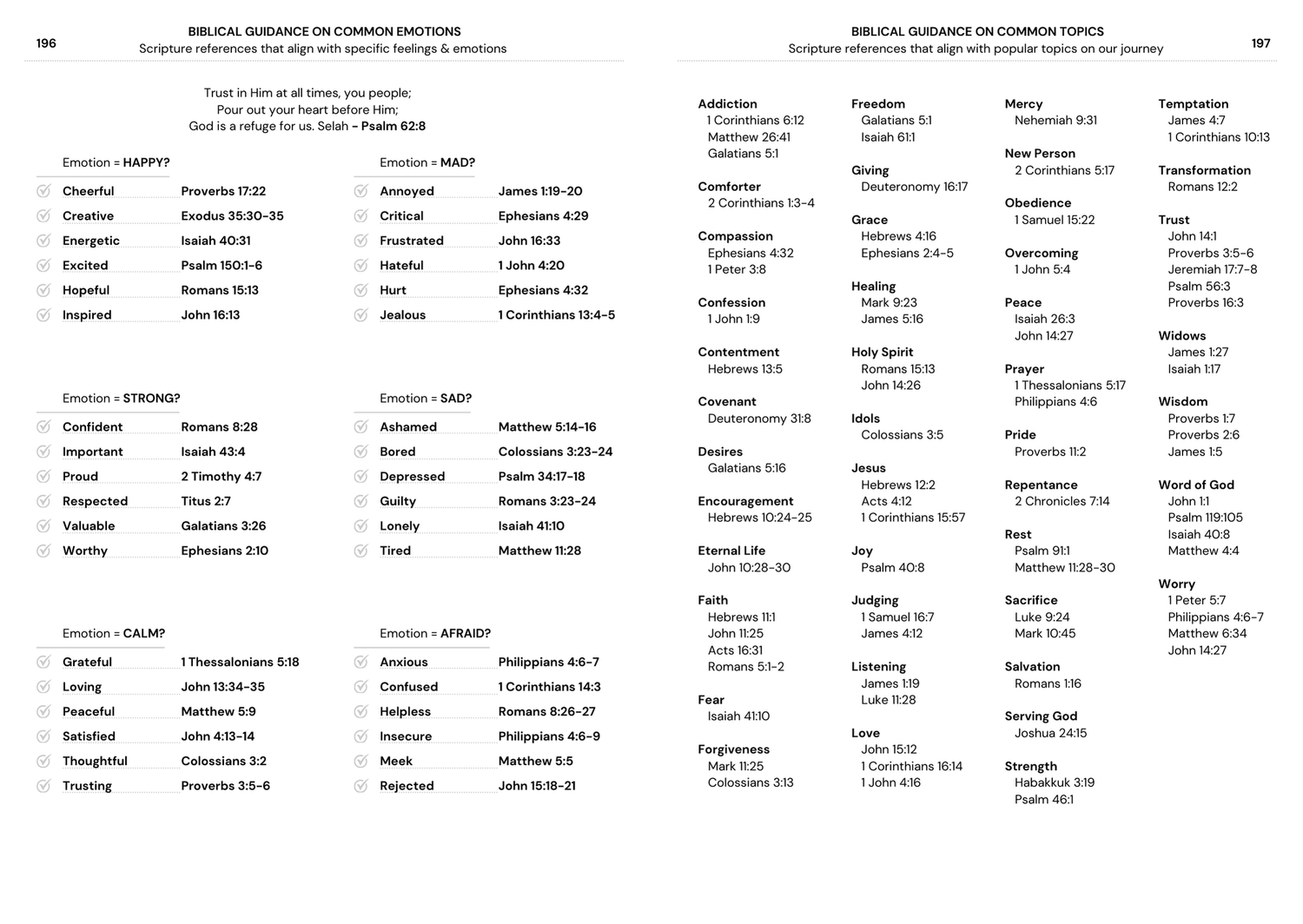Verses of comfort, wisdom, and reminders from the Word of God to offer hope during times of need.